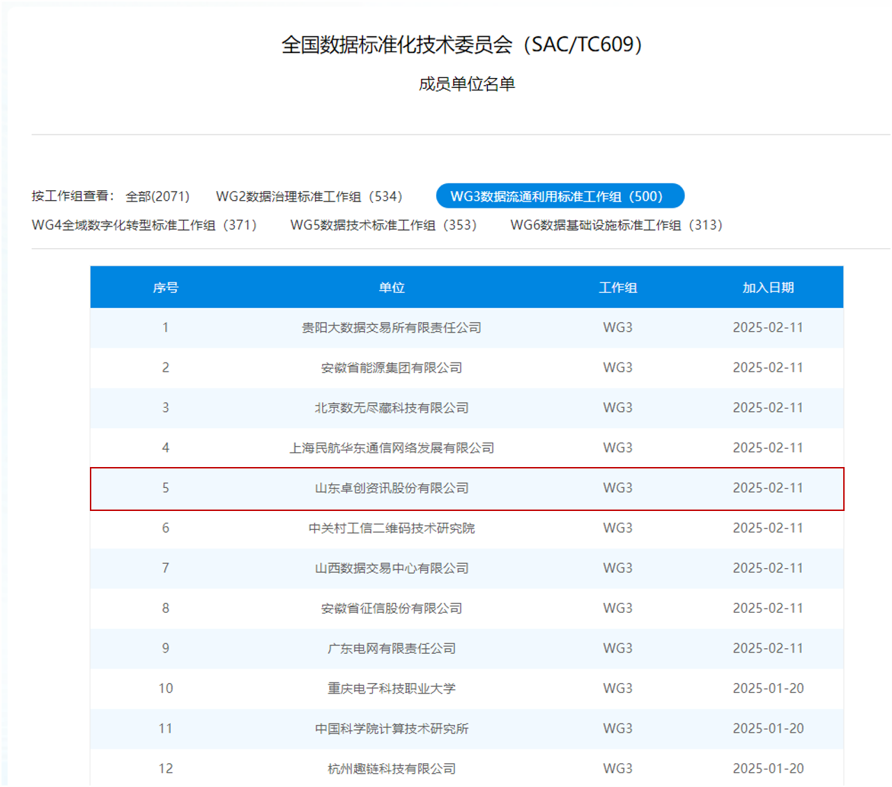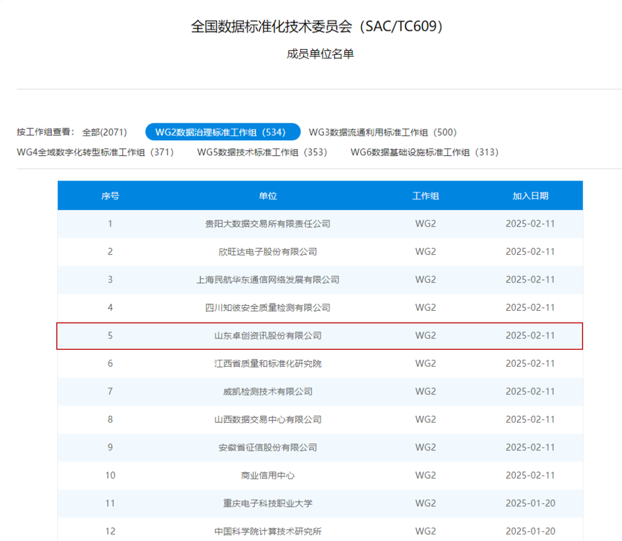 近日,全国数据标准化技术委员会(SAC/TC609,以下简称“全国数标委”)公布成员单位名单,山东卓创资讯股份有限公司(以下简称“卓创资讯”)借在数据治理和数据流通的强大优势,以及在行业内标准化工作的突出表现,成功入选WG2数据治理标准工作组和WG3数据流通利用标准工作组,成为全国数标委首批成员。