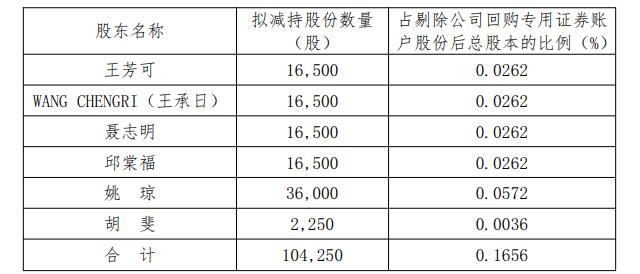 公司副总经理胡斐,持有公司股份9,000股,占公司总股本的0.0143%,计划自公告披露之日起15个交易日后的3个月内(自2026年1月16日至2026年4月15日)以集中竞价交易方式减持公司股份不超过2,250股,占公司总股本的0.0036%。
