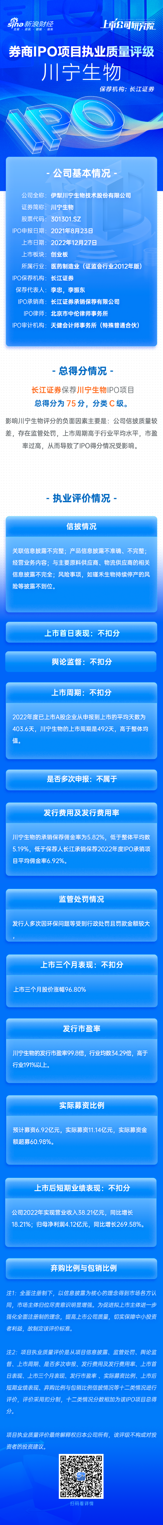 IPO项目总得分75分,分类C级。影响川宁生物评分的负面因素主要是:公司信披质量较差,存在监管处罚,上市周期高于行业平均水平,市盈率过高,从而导致了IPO得分情况受影响。