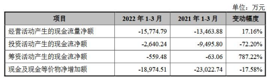 2022年1-3月,公司营业收入1,540.03万元,同比增长96.76%;归属于母公司股东净利润-3,228.47万元,同比增长2.64%;扣除非经常性损益后归属于母公司股东净利润-3,494.13万元,同比增长7.49%;经营活动产生的现金流量净额-15,774.79万元,同比增长17.16%。
