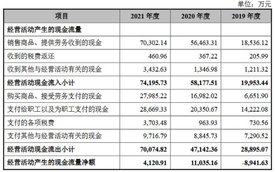 2019年至2021年,华如科技的营业收入分别为31,985.63万元、52,634.99万元、68,641.78万元,归属于母公司所有者的净利润分别为7,083.96万元、9,175.20万元、11,807.13万元,扣除非经常性损益后归属于母公司所有者的净利润分别为6,687.36万元、8,586.27万元、10,625.96万元,经营活动产生的现金流量净额分别为-8,941.63万元、11,035.16万元、4,120.91万元,销售商品、提供劳务收到的现金分别为18,536.12万元、56,463.31万元、70,302.14万元。