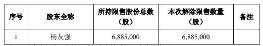 朗坤环境(301305.SZ)今日有6,885,000股首次公开发行前已发行股份解除限售,本次解除限售股份的股东户数为1户。