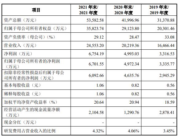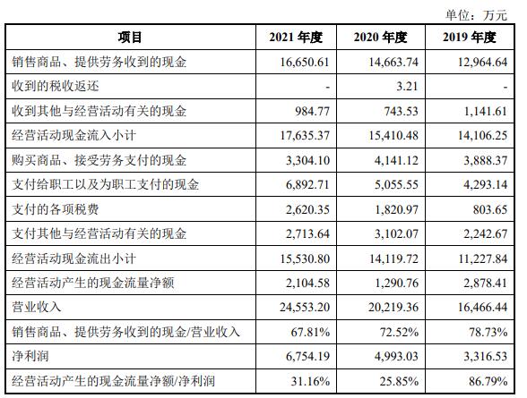 2019年、2020年、2021年,西测测试营业收入分别为16,466.44万元、20,219.36万元、24,553.20万元;净利润分别为3,316.53万元、4,993.03万元、6,754.19万元;归属于母公司所有者的净利润分别为3,335.77万元、4,972.34万元、6,701.55万元;扣除非经常性损益后归属于母公司所有者的净利润分别为2,945.29万元、4,635.76万元、6,092.66万元;经营活动产生的现金流量净额分别为2,878.41万元、1,290.76万元、2,104.58万元;净现比分别为0.87、0.26、0.31。