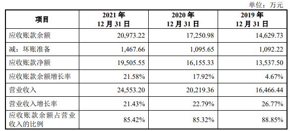 2019年末、2020年末、2021年末,西测测试应收账款余额分别为14,629.73万元、17,250.98万元、20,973.22万元;应收票据情况及应收款项融资分别为3,657.05万元、5,569.78万元、7,578.18万元。