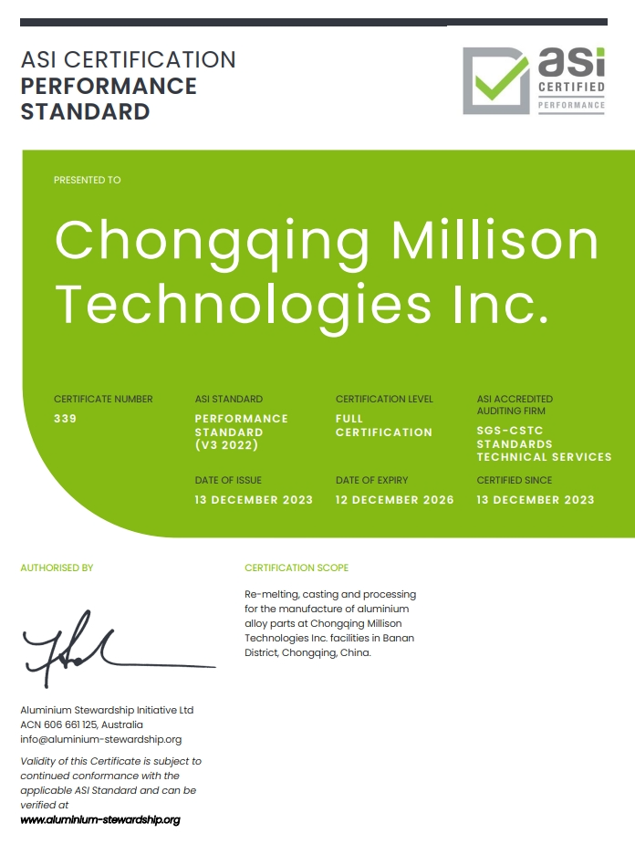 重庆美利信科技股份有限公司(以下简称重庆美利信)位于中国重庆市巴南区制造铝合金零件的铝重熔、铸造和加工的工厂已获得ASI绩效标准(V3版)认证。