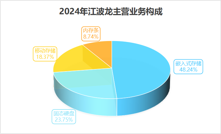 不过,江波龙的产品更多集中在嵌入式存储、固态硬盘等业务上,这些产品的附加值并不高,毛利率基本在20%以下。2024年这两大业务营收占比之和超过七成,拉低公司整体盈利能力。