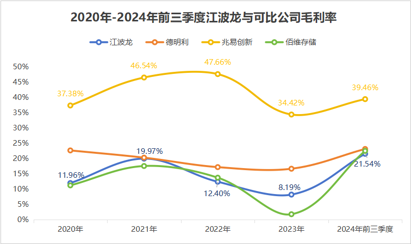 从2020年到2024年前三季度,江波龙的毛利率很少超过20%,大部分时间都低于德明利。跟兆易创新动辄40%的毛利率相比,更是有一定差距。