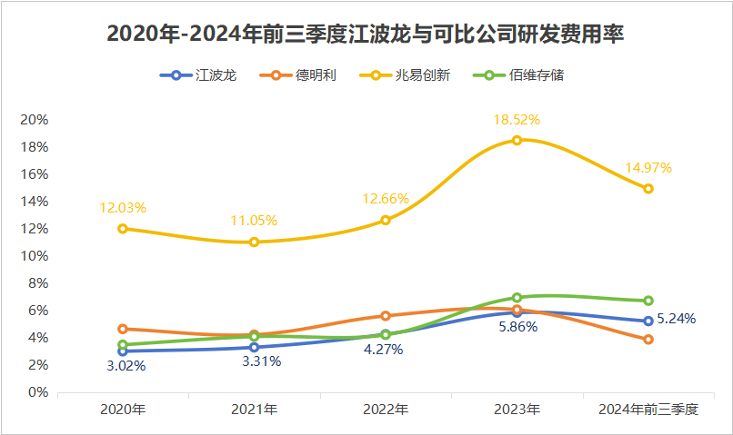 几家存储公司对比来看,2020年到2024年前三季度,江波龙研发费用率常年在5%左右,低于兆易创新,跟德明利和佰维存储相近,整体而言并不算高。