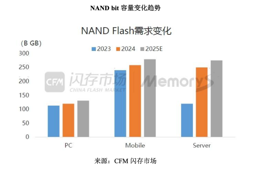 与此同时,大模型的兴起推动包括AI硬件投入的高速增长,服务器出货规模持续提升。下游需求维持温和增长,为半导体存储产业的发展提供了温和的产业环境,根据CFM闪存市场预测,2025年全球NANDFlash Bit需求同比增长约10%,全球DRAM Bit需求同比增长约16%。
