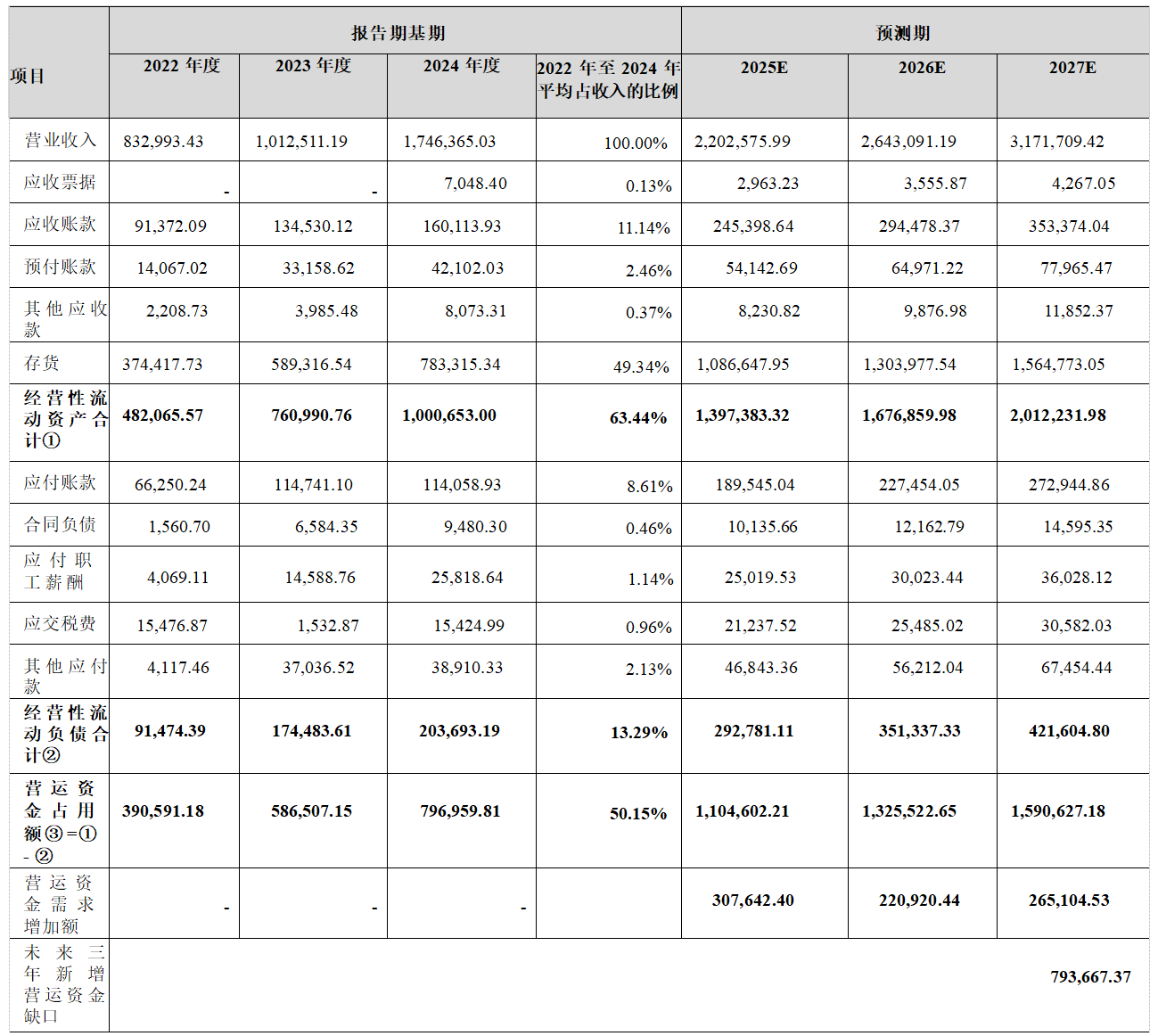 据江波龙测算,2024年、2025年1-9月,公司收入增速分别为72.48%、26.12%,2022年至2024年收入复合增长率为44.79%。假设2025年度收入参照2025年1-9月收入增速26.12%,2026年度、2027年度收入预计增速谨慎设定为20%,预计未来三年累计营运资金需求增加额为79.34亿元。
