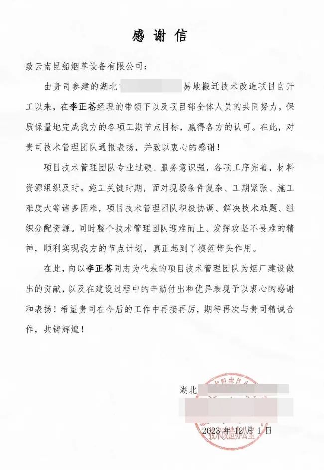 重庆某项目发来的感谢信高度赞扬了项目团队对制丝线升级改造项目的倾情付出。面对环境复杂,安装工期紧、任务重、工序多、零件重等多重困难,项目团队及时调派精兵强将,迅速形成项目建设战线,加班加点、环环紧扣质量、严控项目进度,以饱满的热情和过硬的技术水平,投入到项目建设中。
