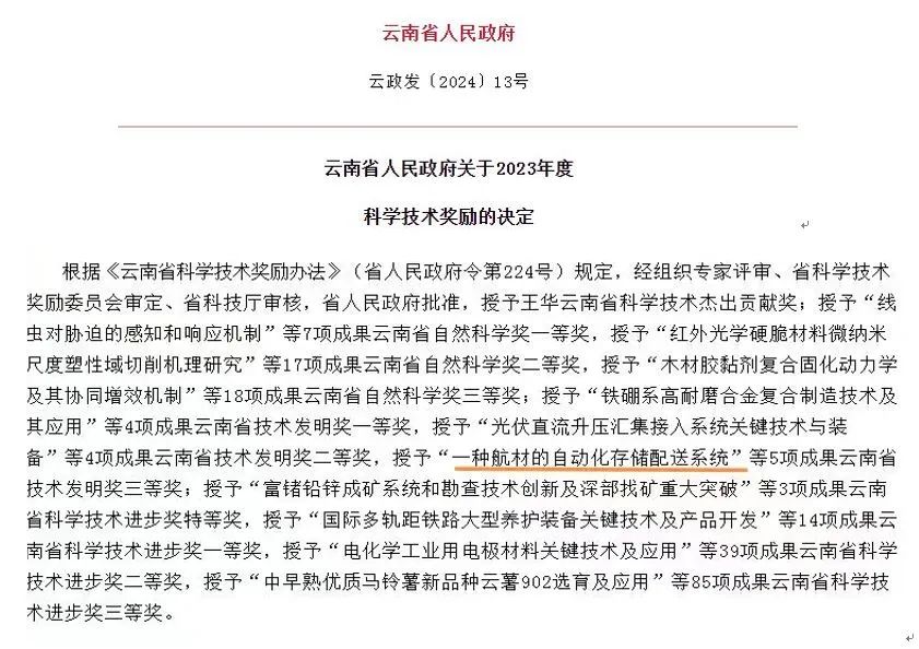 日前,云南省人民政府发布了“云政发[2024]13号《云南省人民政府关于2023年度科学技术奖励的决定》”,昆船智能公司作为独立完成单位申报的“一种航材的自动化存储配送系统”项目,被授予技术发明三等奖。