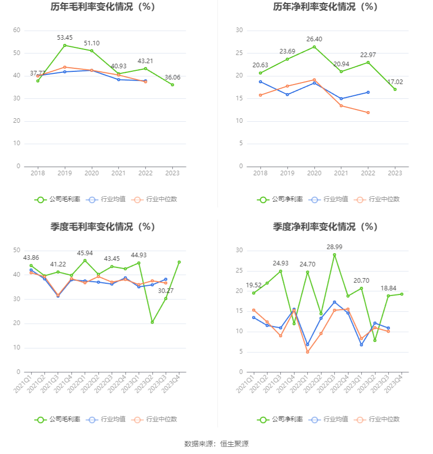 2023年,公司毛利率为36.06%,同比下降7.15个百分点;净利率为17.02%,较上年同期下降5.95个百分点。从单季度指标来看,2023年第四季度公司毛利率为45.30%,同比上升2.77个百分点,环比上升15.03个百分点;净利率为19.26%,较上年同期上升0.47个百分点,较上一季度上升0.42个百分点。