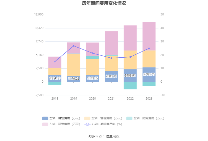 2023年,公司期间费用为1.07亿元,较上年同期增加1252.51万元;期间费用率为24.98%,较上年同期上升6.44个百分点。其中,销售费用同比增长16.09%,管理费用同比下降10.23%,研发费用同比增长12.42%,财务费用由去年同期的-1425.03万元变为-788.49万元。