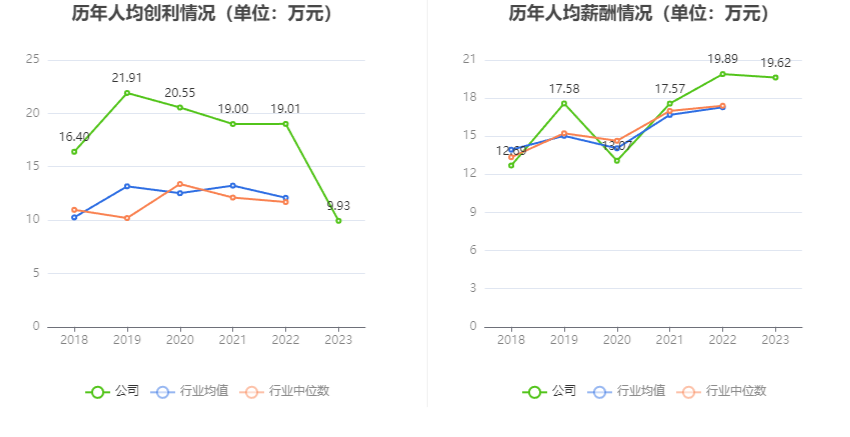 截至2023年末,公司员工总数为731人,人均创收58.47万元,人均创利9.93万元,人均薪酬19.62万元,较上年同期分别下降29.36%、47.77%、1.39%。