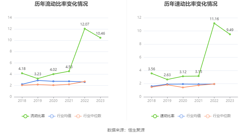 2023年,公司流动比率为10.46,速动比率为9.49。