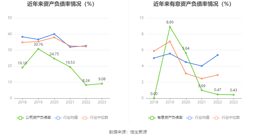 在偿债能力方面,公司2023年年末资产负债率为9.08%,相比上年末上升0.84个百分点;有息资产负债率为0.43%,相比上年末下降0.04个百分点。