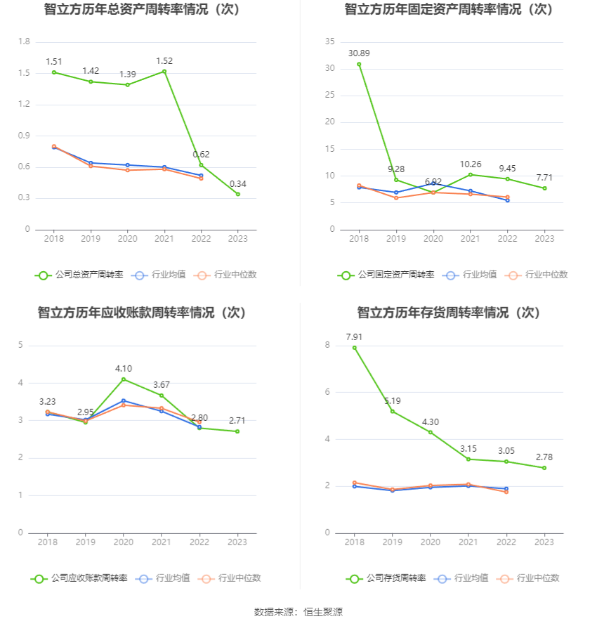 营运能力方面,2023年,公司公司总资产周转率为0.34次,上年同期为0.62次(2022年行业平均值为0.52次,公司位居同行业7/25);固定资产周转率为7.71次,上年同期为9.45次(2022年行业平均值为5.45次,公司位居同行业7/25);公司应收账款周转率、存货周转率分别为2.71次、2.78次。