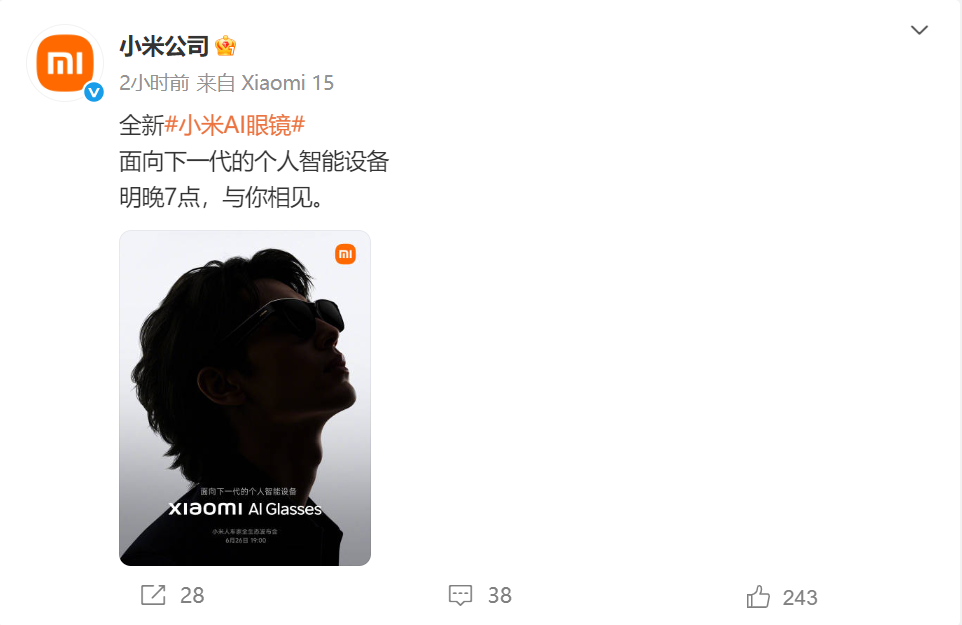 6月25日,小米通过微博官宣,将于6月26日晚7点发布“面向下一代的个人智能设备”小米AI眼镜。