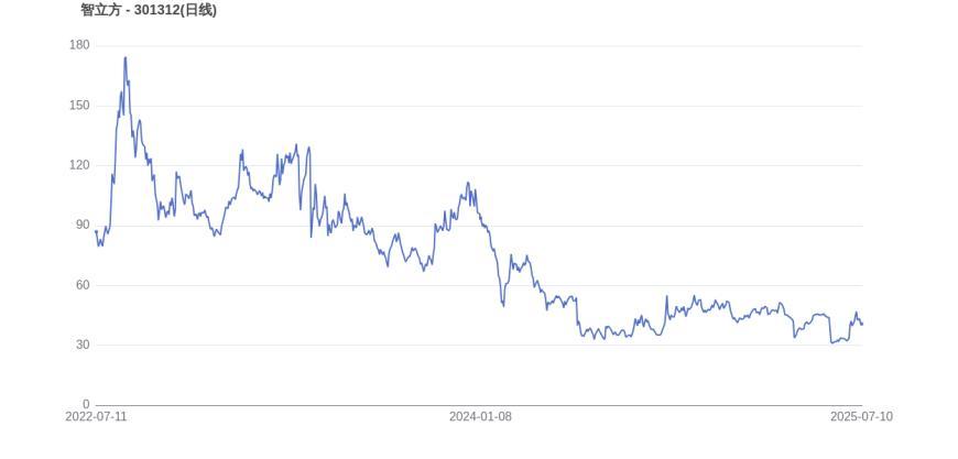 从上市首日至今,智立方的市值实现了0.39倍的增长。2023年5月19日,智立方的市值巅峰达到73.59亿元,股价也顺应升至117.6元。而至7月10日收盘,智立方的股价为40.8元,市值为49.46亿元,相比峰值时期市值减少24.13亿元,市值蒸发了32.79%。
