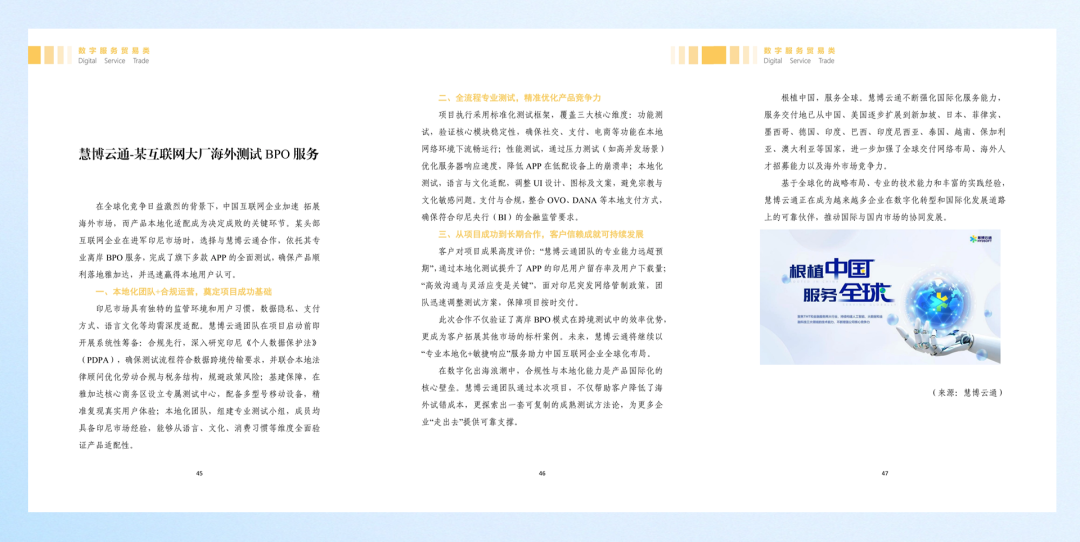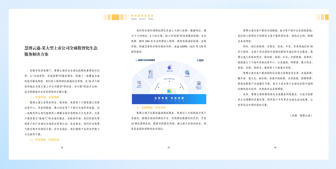 讲好“数贸故事”,传播优秀经验。今年数贸会上, 慧博云通 “某大型上市公司全域数智化生态服务解决方案”、“某互联网大厂海外测试BPO服务”两项实例,作为模式创新、效益突出、前景广阔的数字贸易发展合作案例,双双获选《数字贸易故事集》优秀案例,向世界传播中国经验、中国智慧和中国方案,充分展现了 慧博云通 在国际化发展与助力企业出海中的技术能力和综合实力。