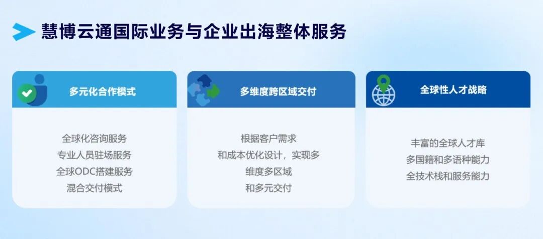 慧博云通 不仅在技术和服务上高标准、严要求,更注重满足不同客户的个性化需求,灵活调整资源配置策略,既能在国内快速组建专业团队启动项目,也能在海外直接招聘当地人才,建立符合当地法律法规和文化习惯的沟通机制,以便迅速响应不同市场的需求,加速客户数智化转型进程。