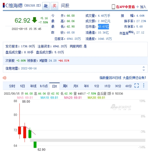 中国经济网北京8月15日讯维海德(301318.SZ)今日破发,盘中最低报62.90元,跌幅7.61%,截至收盘报62.92元,跌幅7.58%,总市值43.67亿元。