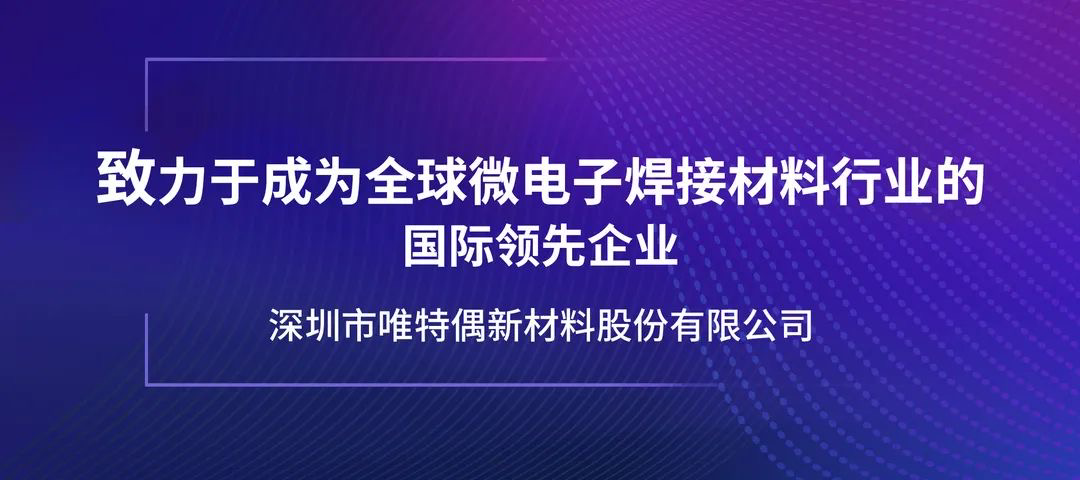 深圳市唯特偶新材料股份有限公司(股票代码:301319),成立于1998年,坐落于粤港澳大湾区核心引擎城市——深圳,是国内集电子焊接材料科研、开发、生产、销售、服务为一体的综合型集团公司;是国家第一批重点高新技术企业,并拥有广东省认定的工程中心;是微电子焊接材料行业第一家在创业板上市的企业。