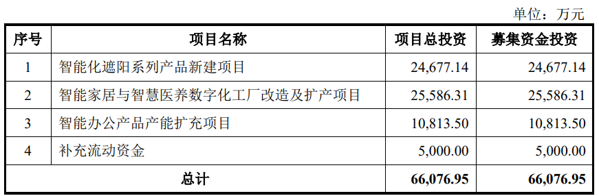豪江智能实际募资净额比原拟募资少12,091.09万元。公司2023年6月5日披露的招股说明书显示,公司拟募集资金66,076.95万元,用于智能化遮阳系列产品新建项目、智能家居与智慧医养数字化工厂改造及扩产项目、智能办公产品产能扩充项目、补充流动资金。