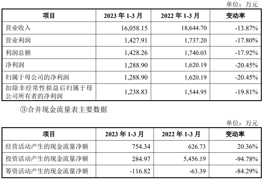 2023年1-3月,豪江智能的营业收入为16,058.15万元,同比下降13.87%;净利润/归属于母公司的净利润为1,288.90万元,同比下降20.45%;扣除非经常性损益后归属于母公司所有者的净利润为1,238.83万元,同比下降19.81%;公司经营活动产生的现金流量净额为754.34万元,上年同期为626.73万元。