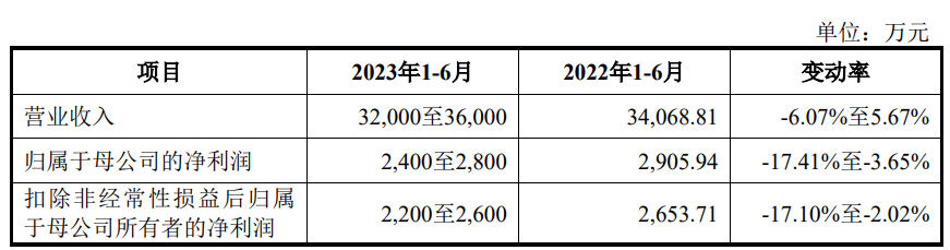 2023年1-6月,公司预计实现营业收入32,000万元至36,000万元,同比变动-6.07%至5.67%;预计实现归属于母公司所有者的净利润为2,400万元至2,800万元,同比变动-17.41%至-3.65%;预计实现扣除非经常性损益后归属于母公司所有者的净利润为2,200万元至2,600万元,同比变动-17.10%至-2.02%。