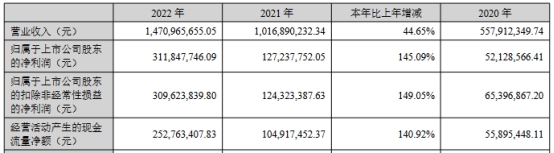 绿通科技2022年年度报告显示,公司实现营业收入14.71亿元,同比增长44.65%;实现归属于上市公司股东的净利润3.12亿元,同比增长145.09%;实现归属于上市公司股东的扣除非经常性损益的净利润3.10亿元,同比增长149.05%;经营活动产生的现金流量净额2.53亿元,同比增长140.92%。