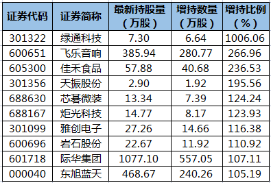 网络数据统计显示,截至5月4日,共有1345只个股获陆股通增仓。其中,持股量环比增幅在50%以上的共有44只,环比增幅最大的是绿通科技,陆股通最新持有7.3万股,持股量环比增幅达1006.06%;环比增幅较大的还有飞乐音响、佳禾食品、天振股份、芯碁微装、炬光科技等股。