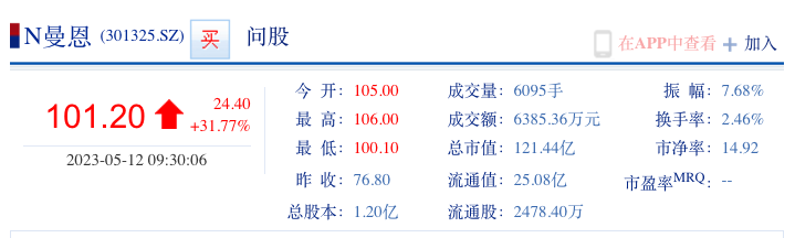 截至9:30,曼恩斯特(301325.SZ)涨31.77%,报101.2元,总市值121.44亿元。