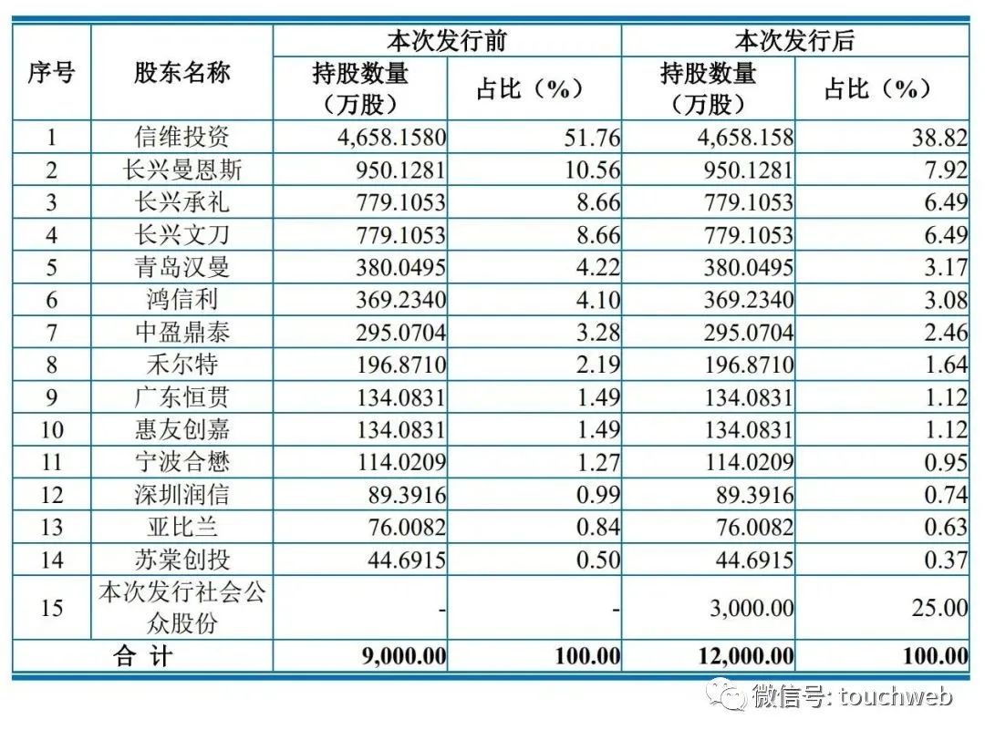 IPO后,信维投资持股为38.82%,长兴曼恩斯持股为7.92%,长兴承礼、长兴文刀分别持股为6.49%,青岛汉曼持股为3.17%。