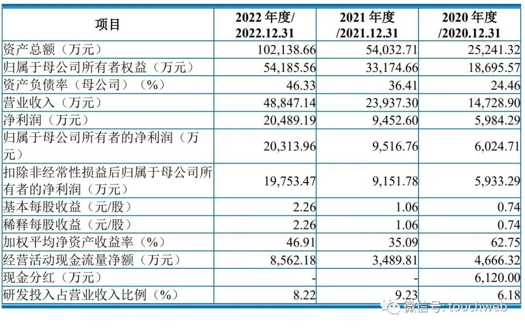 报告期内,曼恩斯特2020年、2021年、2022年营收分别为1.47亿元、2.39亿元、4.88亿元;净利分别为5984万元、9452.6万元、2.05亿元;扣非后净利分别为5933万元、9152万元、1.98亿元。