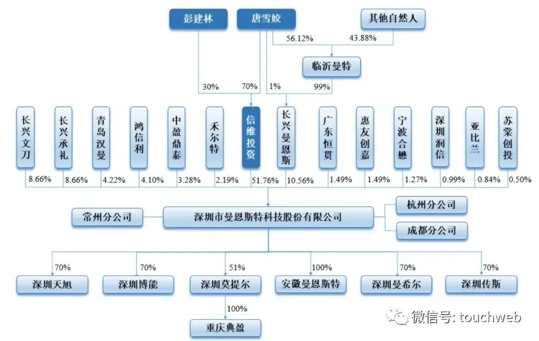 曼恩斯特共同实际控制人为彭建林、唐雪姣夫妇,两人直接或间接合计控制62.32%股权。