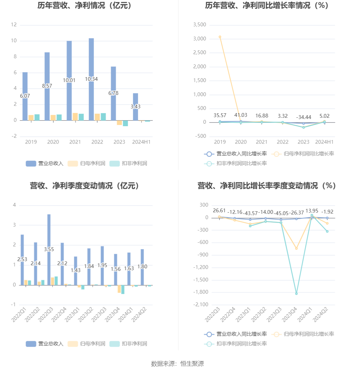根据半年报,公司第二季度实现营业总收入1.8亿元,同比下降1.92%,环比增长10.58%;归母净利润-57.43万元,同比下降133.31%,环比增长88.69%;扣非净利润-680.04万元,同比下降327.80%,环比增长11.10%。
