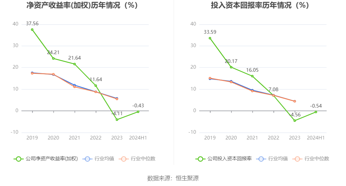 数据显示,2024年上半年公司加权平均净资产收益率为-0.43%,较上年同期增长0.30个百分点;公司2024年上半年投入资本回报率为-0.54%,较上年同期增长0.76个百分点。