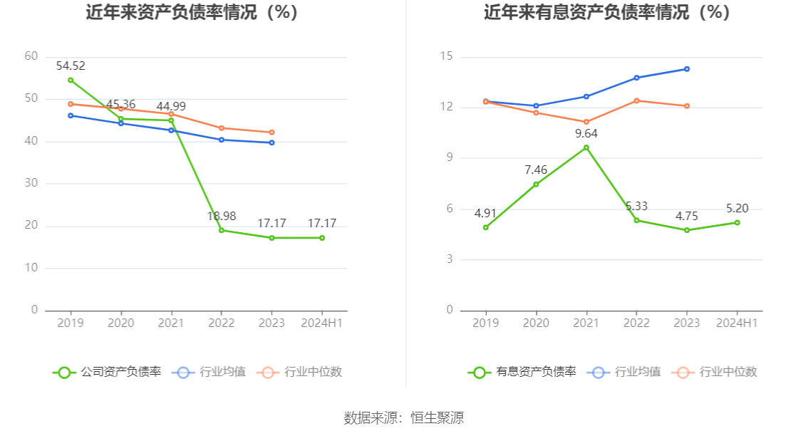 在偿债能力方面,公司2024年上半年末资产负债率为17.17%,相比上年末基本持平;有息资产负债率为5.20%,相比上年末上升0.45个百分点。