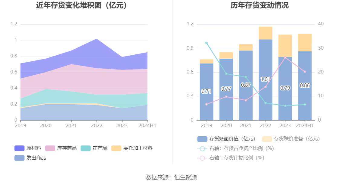 从存货变动来看,截至2024年上半年末,公司存货账面价值为8579.32万元,占净资产的6.55%,较上年末增加667.69万元。其中,存货跌价准备为2173.2万元,计提比例为20.21%。
