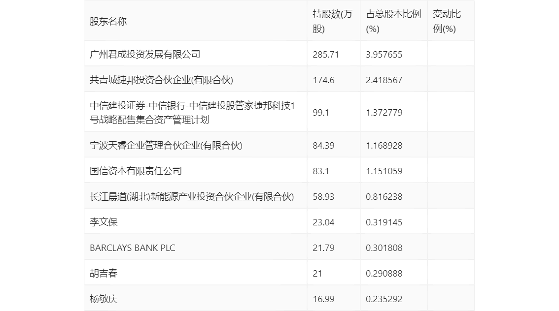 半年报显示,2024年上半年末公司十大流通股东中,新进股东为李文保、BARCLAYS BANK PLC,取代了一季度末的赵吉、张莉。在具体持股比例上,长江晨道(湖北)新能源产业投资合伙企业(有限合伙)、胡吉春、杨敏庆持股有所下降。