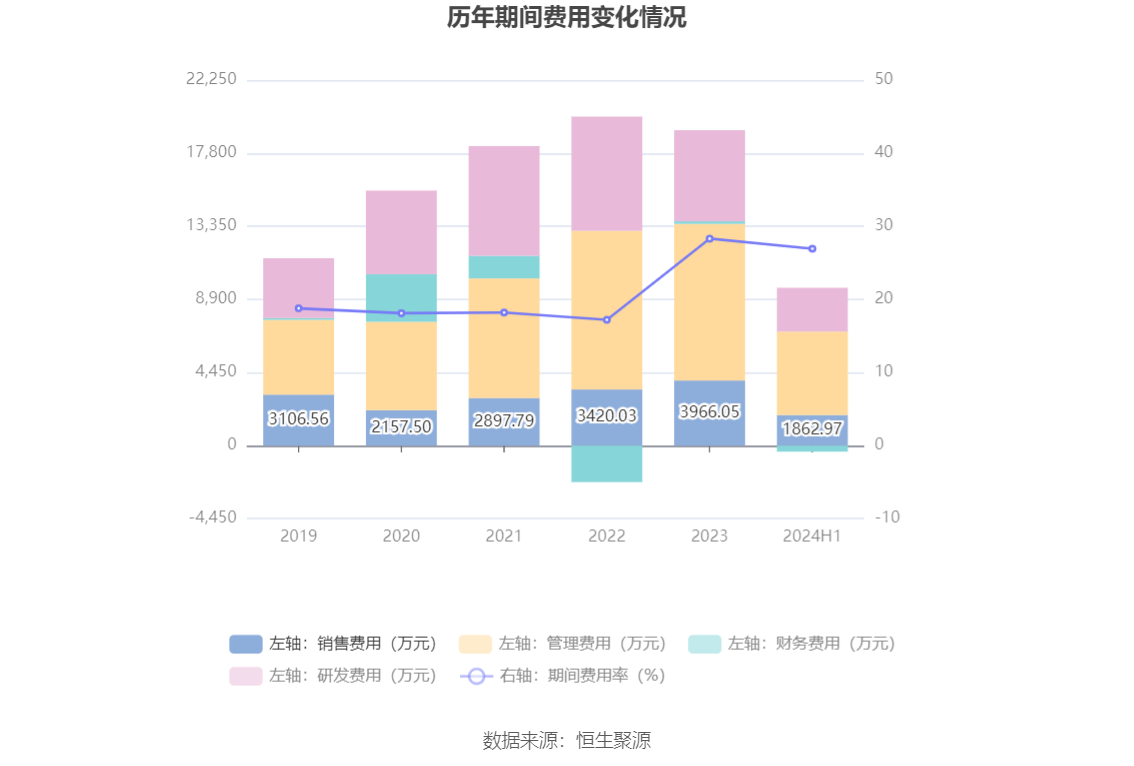 2024年上半年,公司期间费用为9242.65万元,较上年同期减少566.06万元;期间费用率为26.93%,较上年同期下降3.09个百分点。其中,销售费用同比下降14.42%,管理费用同比增长4.89%,研发费用同比下降12.98%,财务费用由去年同期的-274.09万元变为-365.62万元。