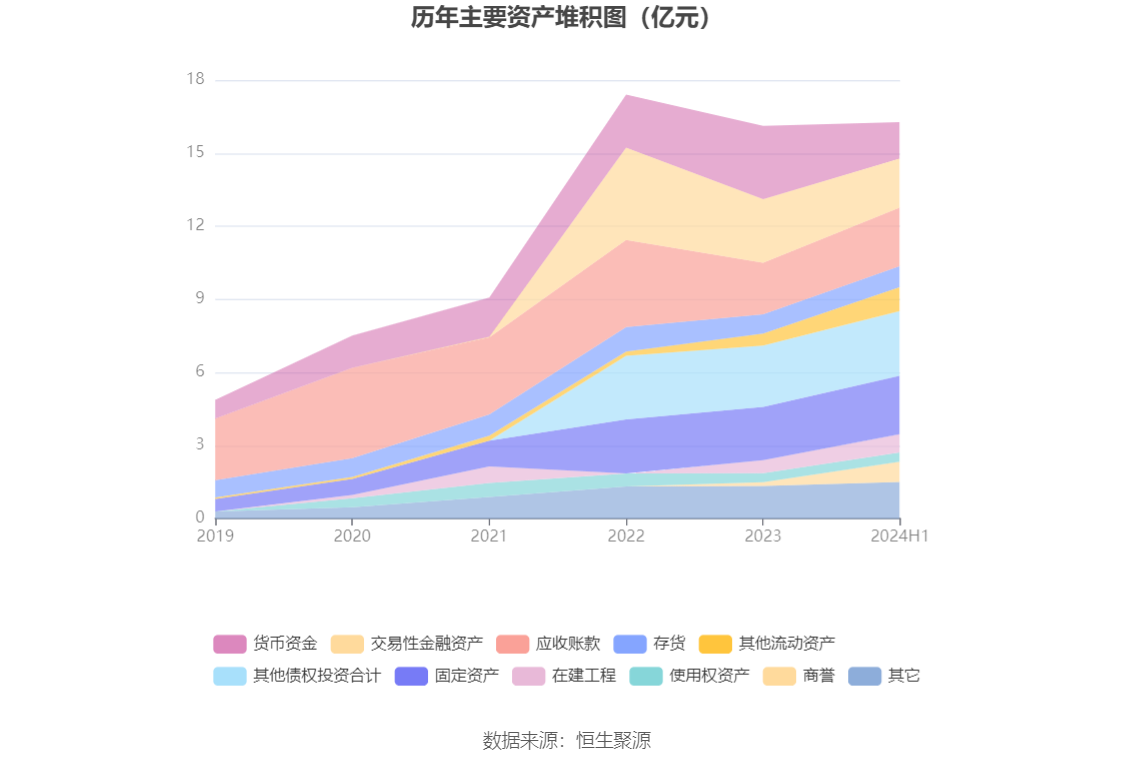 资产重大变化方面,截至2024年上半年末,公司货币资金较上年末减少50.53%,占公司总资产比重下降9.52个百分点;商誉较上年末增加463.81%,占公司总资产比重上升4.19个百分点;交易性金融资产较上年末减少22.55%,占公司总资产比重下降3.77个百分点;其他流动资产较上年末增加102.86%,占公司总资产比重上升3.07个百分点。