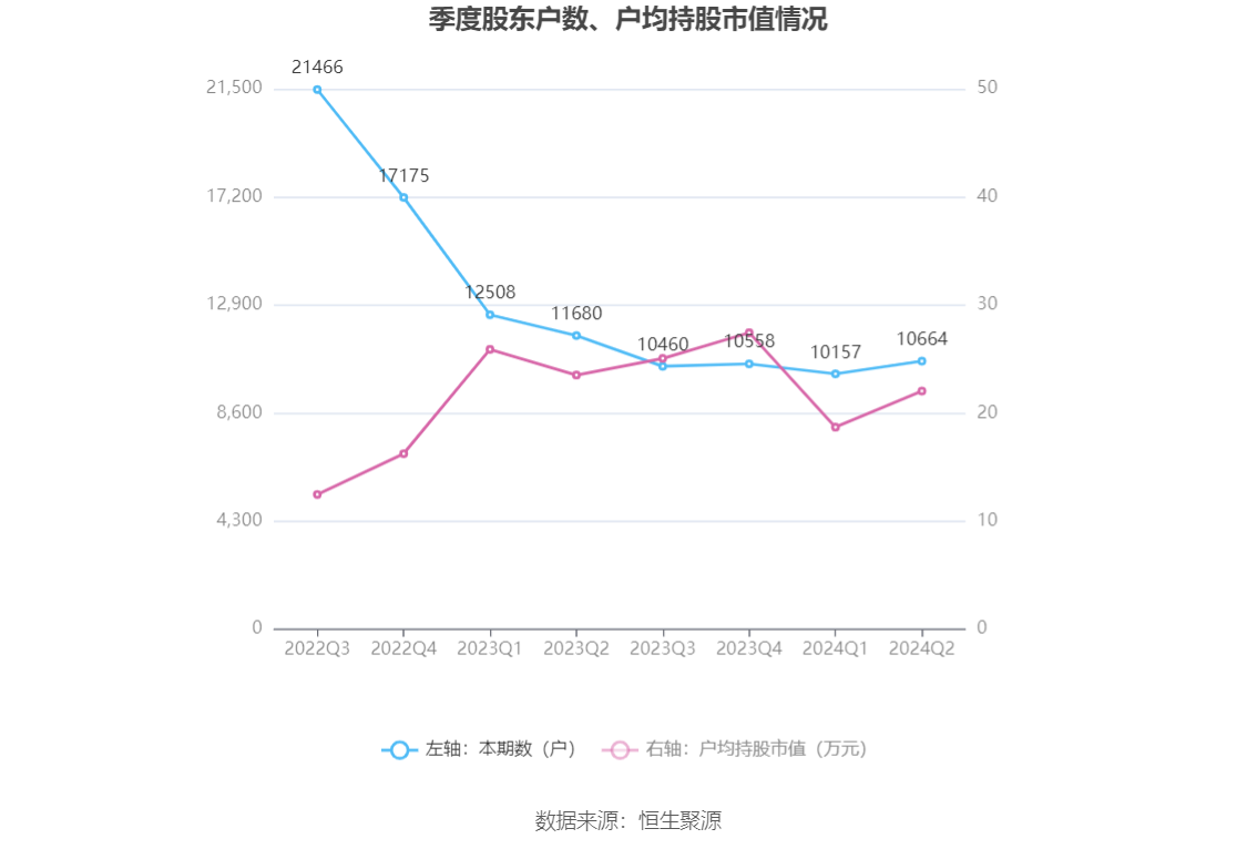 筹码集中度方面,截至2024年上半年末,公司股东总户数为1.07万户,较一季度末增长了507户,增幅4.99%;户均持股市值由一季度末的18.69万元上升至22.03万元,增幅为17.87%。