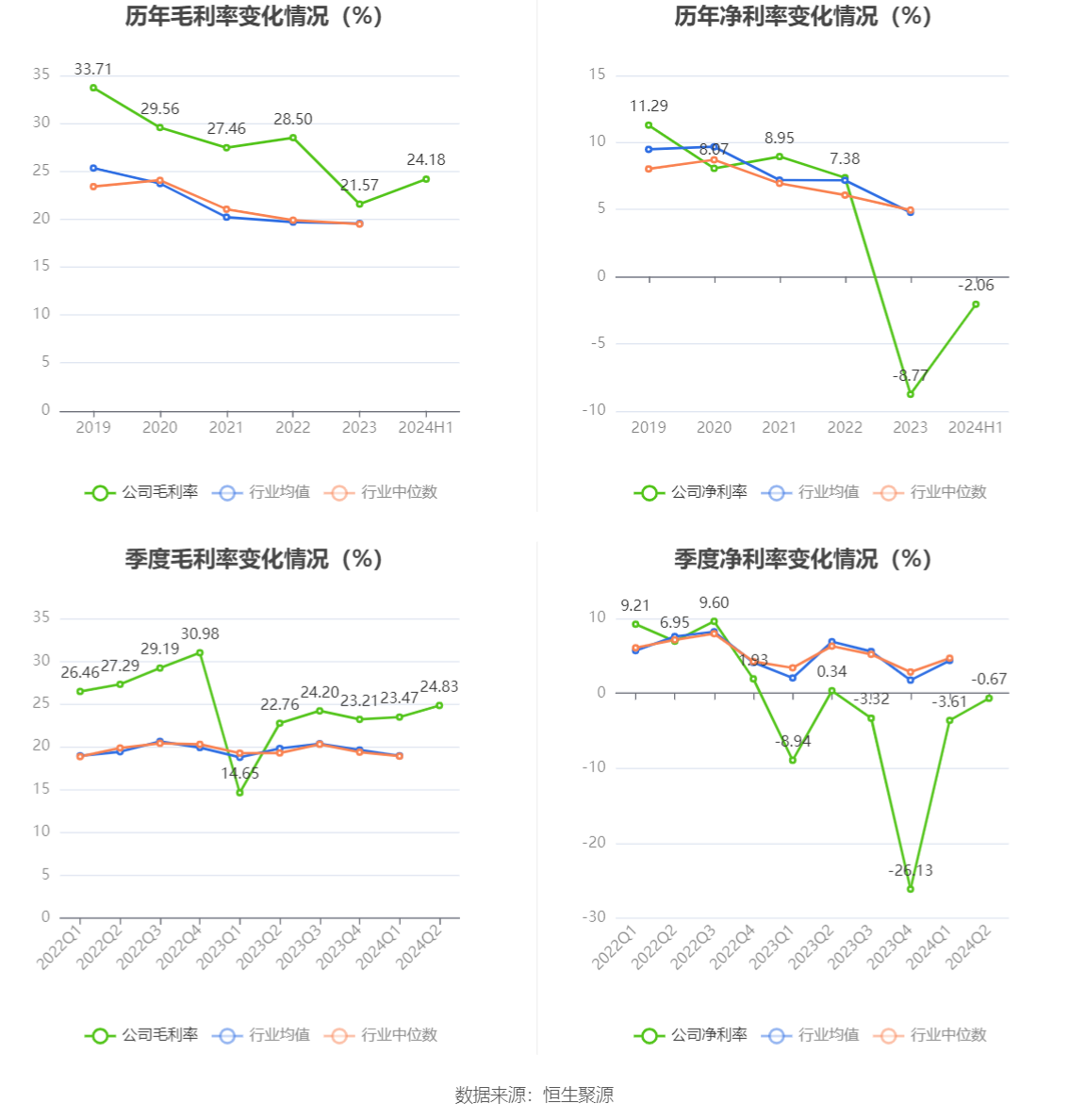 2024年上半年,公司毛利率为24.18%,同比上升4.97个百分点;净利率为-2.06%,较上年同期上升1.66个百分点。从单季度指标来看,2024年第二季度公司毛利率为24.83%,同比上升2.07个百分点,环比上升1.36个百分点;净利率为-0.67%,较上年同期下降1.01个百分点,较上一季度上升2.94个百分点。