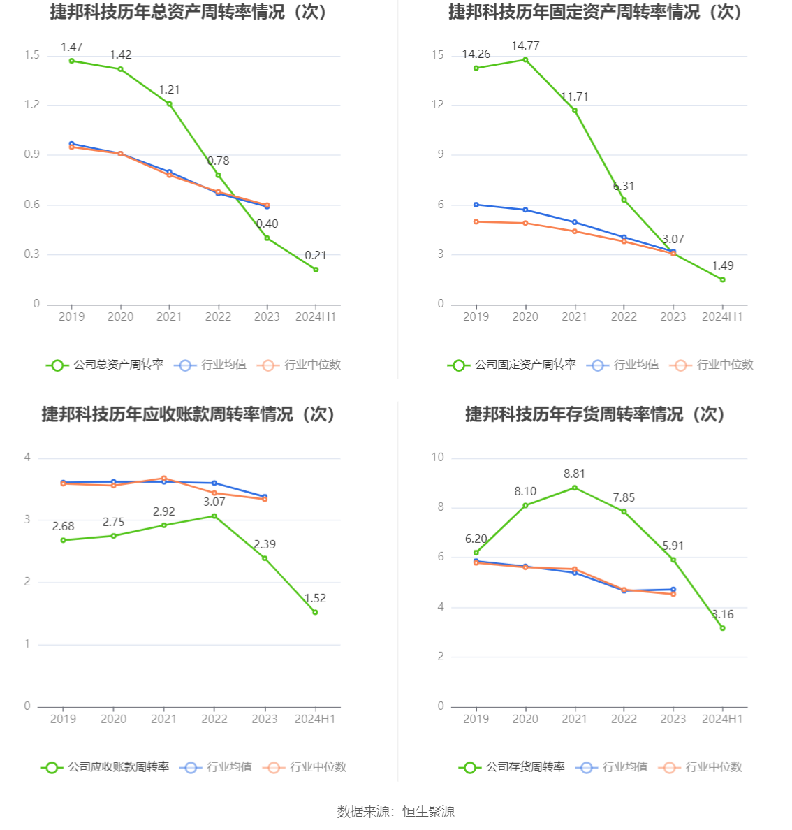 营运能力方面,2024年上半年,公司公司总资产周转率为0.21次,上年同期为0.19次(2023年上半年行业平均值为0.28次,公司位居同行业68/86);固定资产周转率为1.49次,上年同期为1.48次(2023年上半年行业平均值为1.52次,公司位居同行业45/86);公司应收账款周转率、存货周转率分别为1.52次、3.16次。