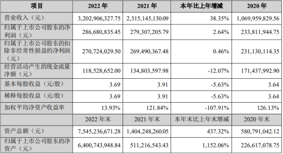 华宝新能2022年营业收入为32.03亿元,同比增长38.35%;归属于上市公司股东的净利润为2.87亿元,同比增长2.64%;归属于上市公司股东的扣除非经常性损益的净利润为2.71亿元,同比增长0.46%;经营活动产生的现金流量净额为1.19亿元,同比减少12.07%。