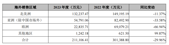 从2021年开始,华宝新能境外销售收入的占比均超过90%。2023年,公司境外、境内分别实现收入21.11亿元和2.03亿元,在营收中的占比分别为91.24%和8.76%。值得注意的是,境外市场的收入大幅下滑了29.96%。其中,公司在北美洲、亚洲(除中国市场)及欧洲等主要区域的收入均出现下滑,下降幅度分别为11.37%、33.58%和66.94%。