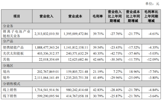 体现在收入端,华宝新能2023年便携储能产品实现收入18.88亿元,同比下滑23.45%;光伏太阳能板的收入为4.03亿元,同比下滑42.73%。此外,上述产品的毛利率也分别下滑至39.54%和40.35%。